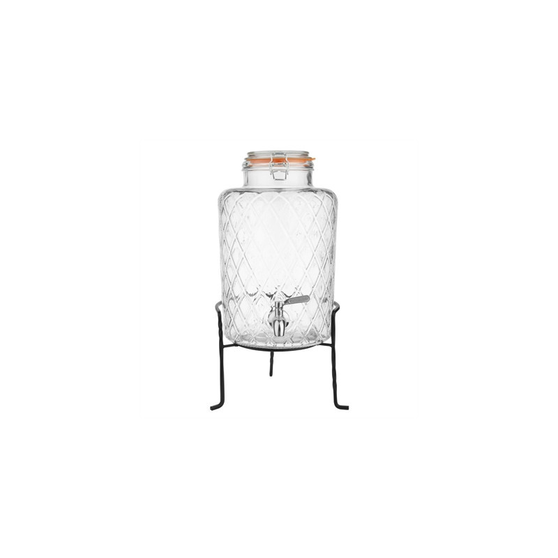 Made from soda lime glass, the Olympia Geo Glass Drinks Dispenser allows for easy content identification of contents. The dispenser is mounted on a sturdy wire stand that elevates it for easier pouring. After use, the glass container is dishwasher safe, making cleanup simple and efficient.