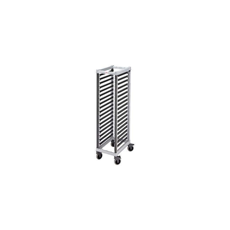 The Camshelving® GN 1/1 Food Pan Trolley represents the evolution of food service transport. Unlike the array of metal trolleys on the market, both aluminum and steel, the Cambro unit is constructed with state-of-the-art composite material. Stronger than steel, but without the failing weld points, rust, and corrosion, our composite trolley performs consistently in the most demanding kitchens. This sleek design presents well front or back of house, carrying standard Gastronorm food pans. Modular component-based construction eases the cost of maintenance, with all parts replaceable. The wide 7,6 cm rail spacing offers the greatest versatility and ease of use, with 3 mm pan stops at each end of the rails to provide stability. A fresh, user friendly take on the traditional food pan trolley, the Food Pan Trolley eliminates the noise and wear of metal on metal.