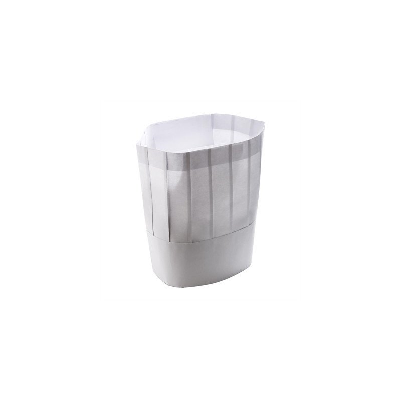 Maintain a clean and sanitary kitchen with this pack of disposable chef's hats. Designed in a classic style, these 177mm/7-inch paper hats effectively keep hair and sweat out of food, promoting cleanliness and food safety. Their adjustable design ensures a comfortable fit for various head sizes. As a disposable option, they offer a budget-friendly alternative to reusable cloth hats, eliminating the need for washing.
