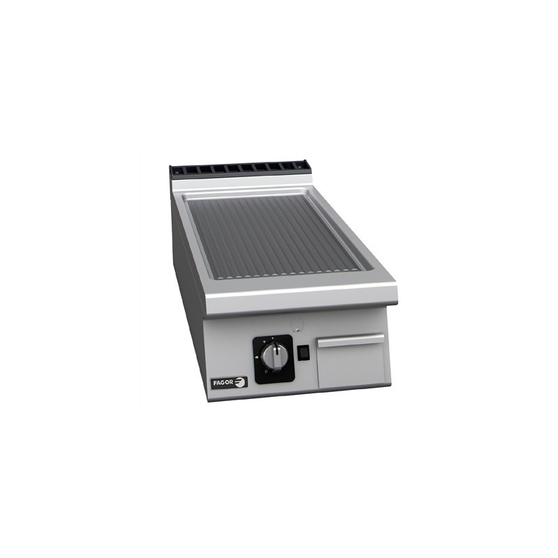 Powerful and reliable, the FT-G905 R Fagor 900 Series countertop ribbed plate gas griddle provides the perfect cooking surface for busy professional kitchens. Providing an impressive 9.25kW of power across its 400mm wide, 20mm thick mild steel ribbed cooking plate, you get a fast heat-up and rapid recovery times - essential for those busy lunch or dinner hours.