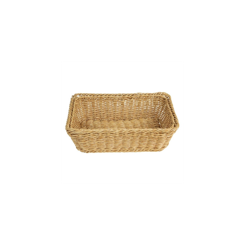 Introducing the Olympia rectangular serving basket, crafted from durable polywicker in a light brown finish. Measuring 300mm in length, it's ideal for displaying breads, pastries and other baked goods at breakfast buffets or during lunch and dinner service. The rustic, farmhouse-style design enhances the visual appeal of your food presentation, helping draw attention to what's on offer. Once service is finished, simply place the basket in the dishwasher for easy cleaning.
