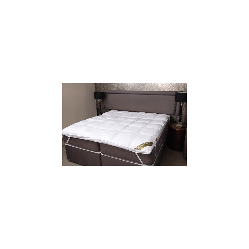 Our most luxurious mattress topper, filled with siliconised ball fibre in a 100% cotton cambric cover for optimum comfort. The Duke mattress topper has a special box construction to prevent the filling from moving around. Attaches to the mattress via elastic straps at each corner. Box construction may require some manipulation. Filling: siliconised ball fibre. Fitting: elasticated bands. Cover: 100% cotton cambric. Weight: 1,300g/m².