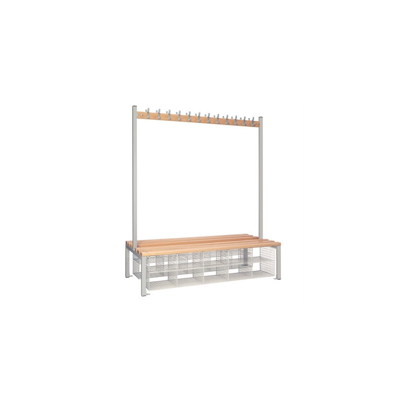 This double-sided seating island is an ideal choice for various settings such as schools, gyms and staff changing rooms. Constructed with durability in mind, its robust steel framework is powder-coated in an attractive grey shade, ensuring both strength and a visually appealing design. The slatted seat, crafted from hardwearing beech wood, offers comfort and support, making it the perfect furniture piece for any changing space.