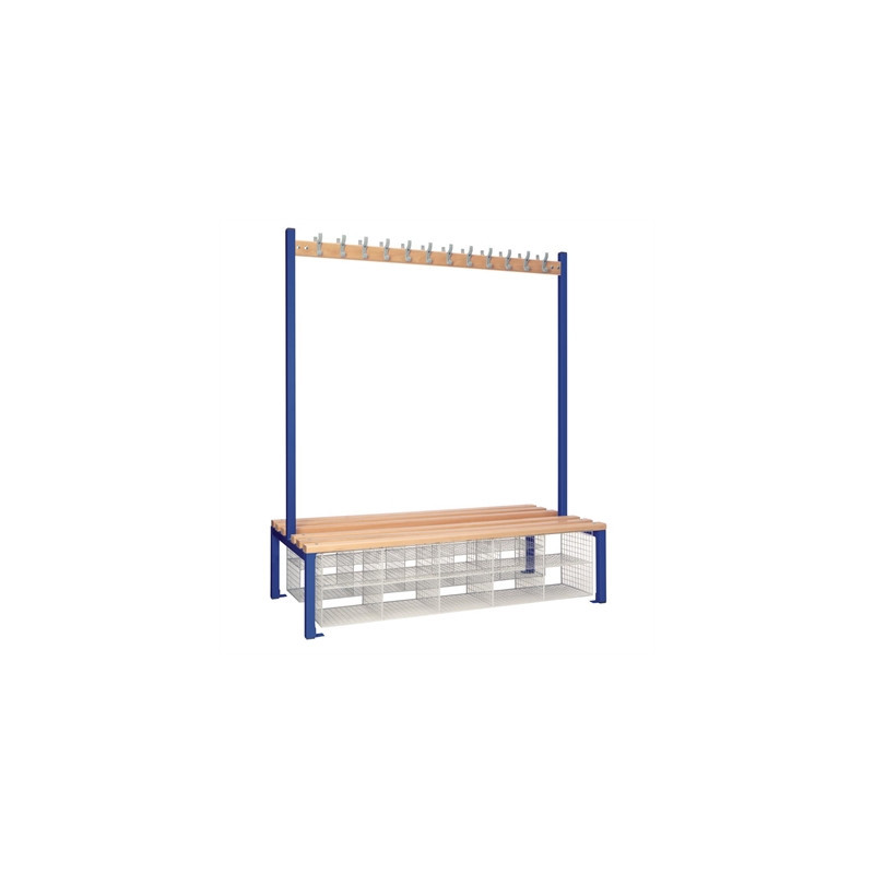 This double-sided seating island is an ideal choice for various settings such as schools, gyms and staff changing rooms. Constructed with durability in mind, its robust steel framework is powder-coated in an attractive blue shade, ensuring both strength and a visually appealing design. The slatted seat, crafted from hardwearing beech wood, offers comfort and support, making it the perfect furniture piece for any changing space.