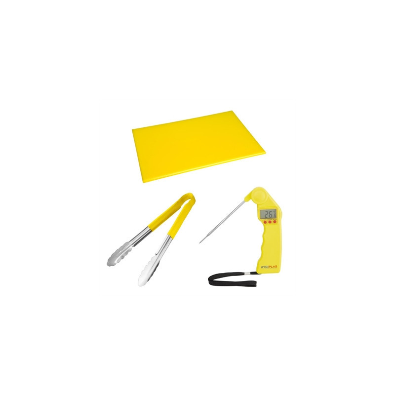 With colour coded yellow utensils for cooked meats, this set includes a sturdy pair of Hygiplas tongs, a high density Hygiplas chopping board, and an accurate portable Hygiplas thermometer - essential utensils for every professional kitchen.
