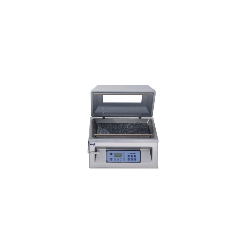 Vacuum packing machine recommended for use with waterbaths, the double seam and sever closure not only seals the pouch but prevents contamination of the waterbath. Programmable control panel allows vacuum levels for different products to be pre-stored. Filler plates adjust for different height products and speed up vacuum time.