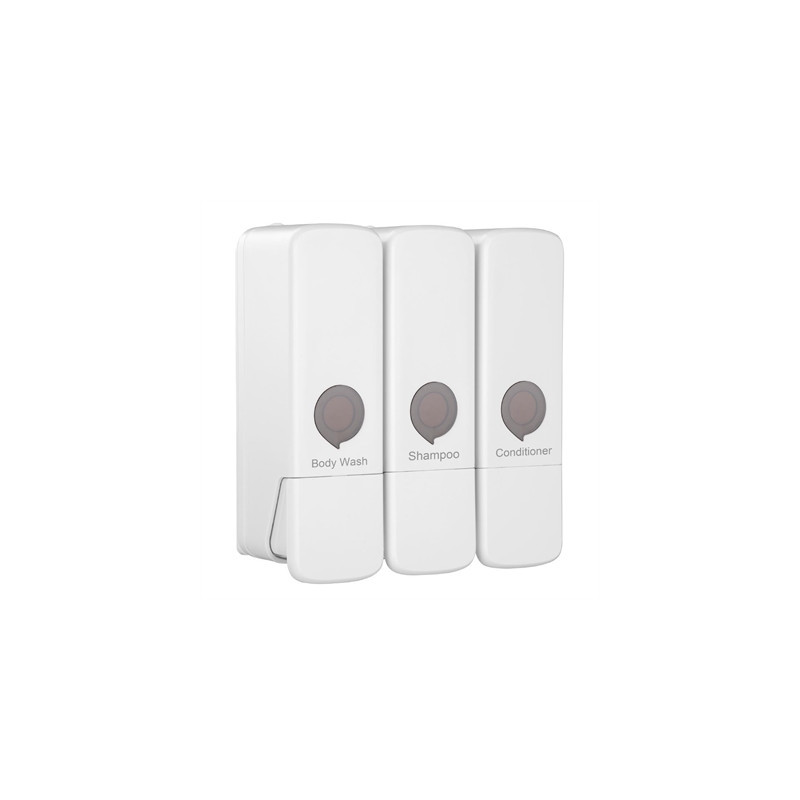 Elevate your hygiene setup with this wall-mounted triple shower/washroom dispenser from Jantex. Versatile and efficient, the dispenser is designed to neatly dispense body wash, shampoo, and conditioner from one sleek unit. Its durable, high-gloss ABS plastic construction provides resistance to impact, moisture and daily wear.